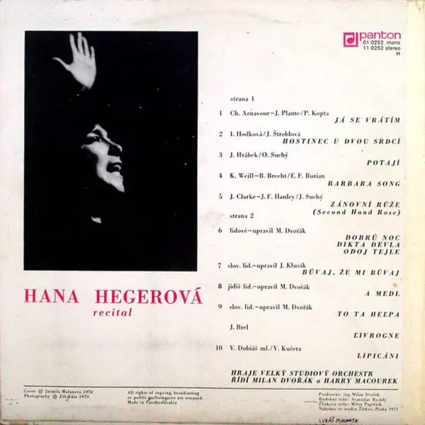 Hana Hegerová byla známá československá zpěvačka a herečka, často označovaná jako "první dáma českého šansonu". Narodila se 20. října 1931 v Bratislavě a na uměleckou dráhu se vydala po absolvování pražské konzervatoře. Hegerová proslula zejména svým výrazným hlasem a emotivní interpretací písní. Během své kariéry se specializovala na šanson a písně ve francouzském stylu, které se staly její poznávací značkou.