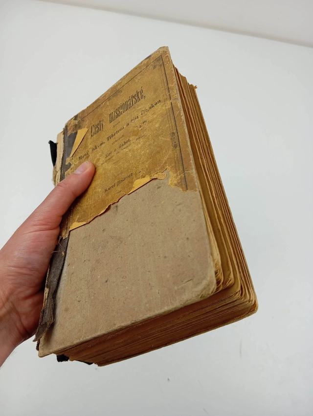 Přední desky volně, Natržený hřbet, nafoceno, vazba lehce povolená, zatím drží většina knižnoho bloku pospolu