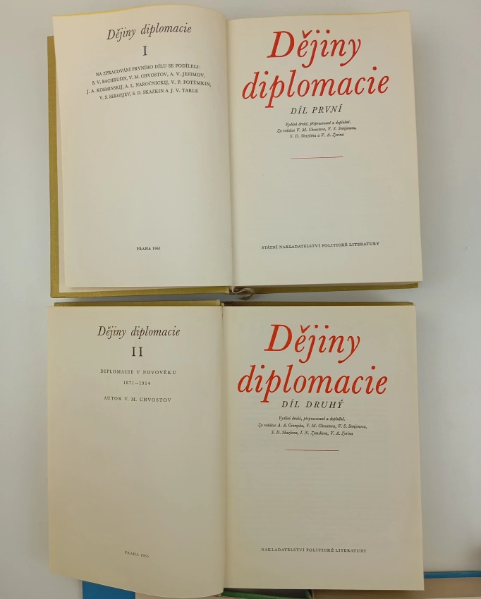 Dějiny diplomacie, Díl 1 1961 Díl první (756 s., 2. vyd.)Dějiny diplomacie, Diplomacie v novověku 1871-1914 1965 Díl druhý (751 s., 2. vyd.)