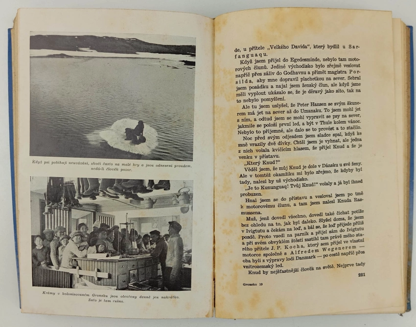 natrhnutá obálka, stopy po plísni na deskách, stránky s flíčky, neautorský podpis, obálka s polepkou