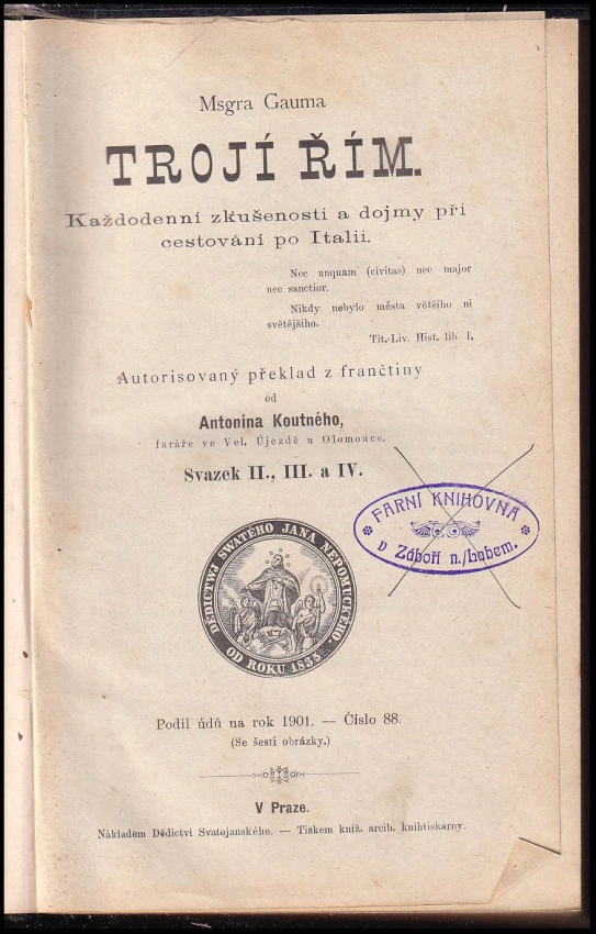 Msgra Gauma Trojí Řím, každodenní zkušenosti a dojmy při ces... 1897 Sv. 1 (396 s.)Trojí Řím, Každodenní zkušenosti a dojmy při ces... 1901 Sv. 2., 3. a 4 (26, 737)
