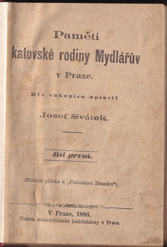 Paměti katovské rodiny Mydlářův v Praze 1886 Díl první (320 s.)Paměti katovské rodiny Mydlářův v Praze 1887 Díl druhý (371 s.)