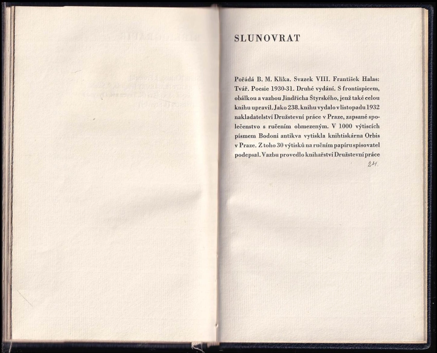 Tvář PODPIS FRANTIŠEK HALAS, VÝTISK č. 24 z 30, poesie 1930-31, OBÁLKA A FRONTISPICE JINDŘICH ŠTYRSKÝ
