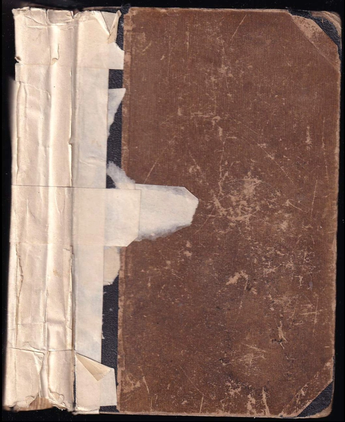 bez hřbetu, zkosený hřbet, stránky s fleky, razítko původního majitele