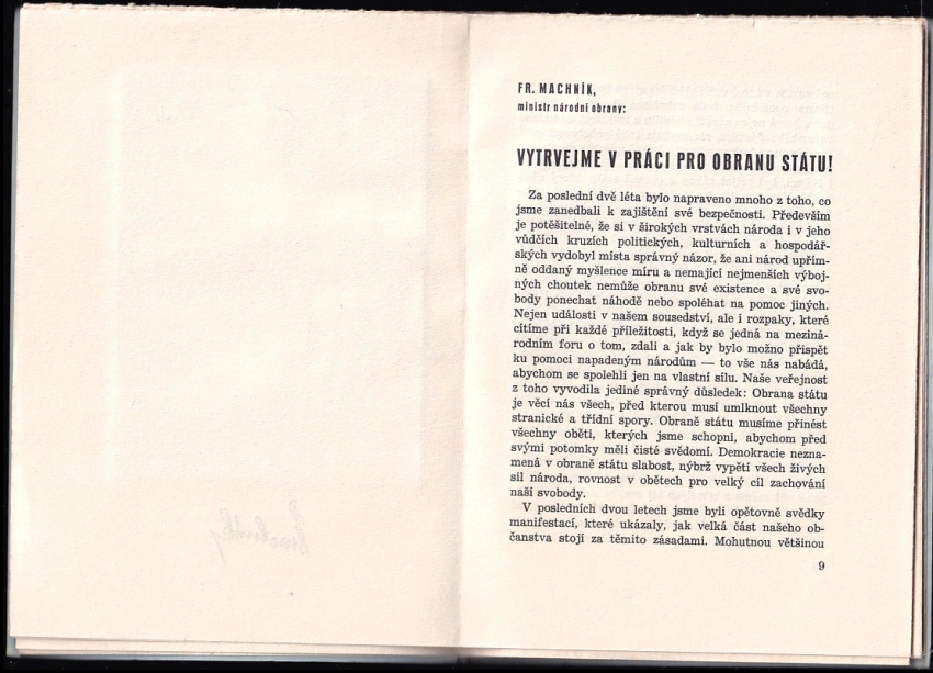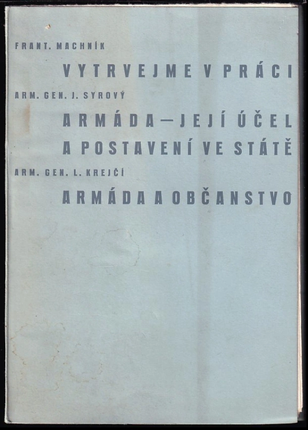 : Projevy : Fr. Machník : Vytrvejme v práci pro obranu státu! ; J. Syrový : Armáda - její účel a postavení ve státě ; L. Krejčí : Armáda a občanstvo