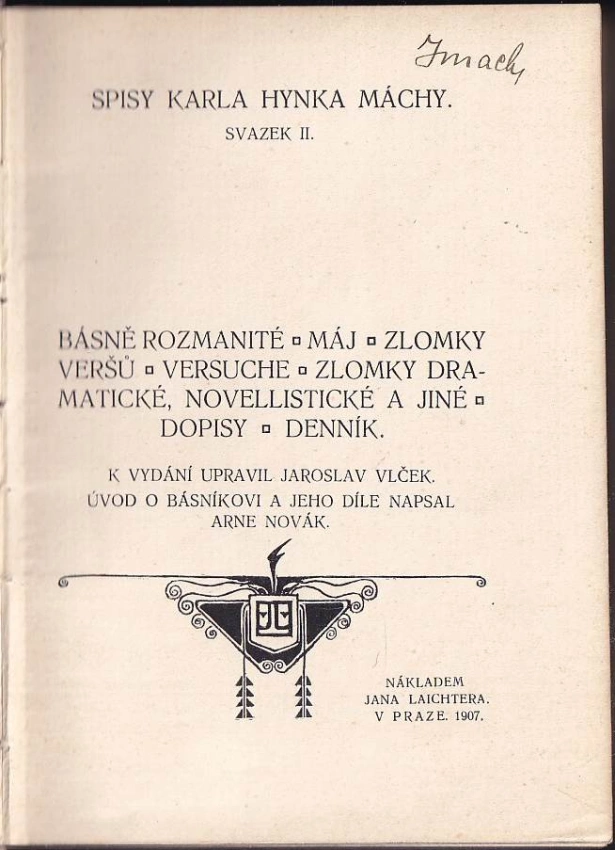 : Máj ; Zlomky veršů ; Versuche ; Zlomky dramatické, novellistické a jiné ; Dopisy ; Denník / c [Karel Hynek Mácha] ; k vydání upravil Jaroslav Vlček ; úvod o básníkovi a jeho díle napsal Arne Novák