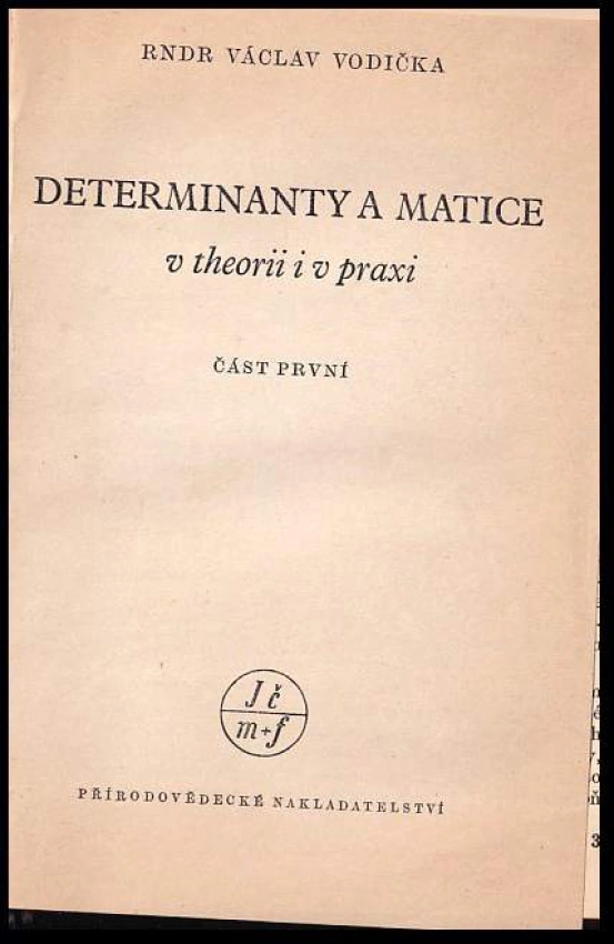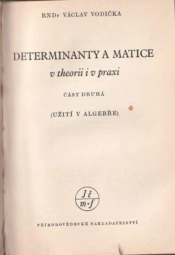Determinanty a matice v theorii i v praxi 1950 Část první (92 s., 1. vyd.)Determinanty a matice v theorii i v praxi, (Užití v algebře) 1950 Část druhá (139, [3], 1. vyd.)