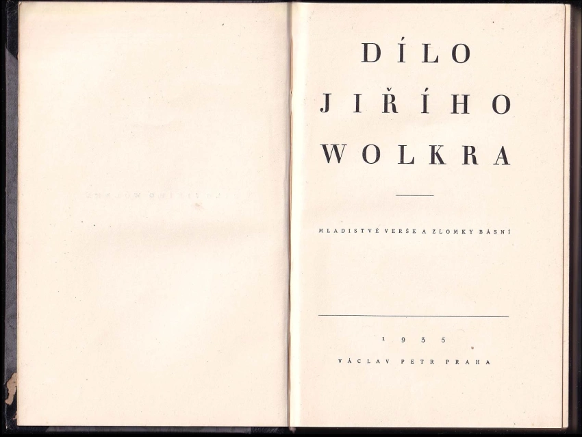 Dílo Jiřího Wolkera 1938 [Díl 1] (326 s., 9. vyd.)Dílo Jiřího Wolkra, Mladistvé verše a zlomky básní 1935 II. (329 s., 4. vyd.)