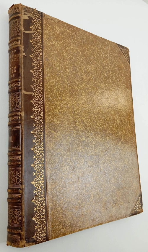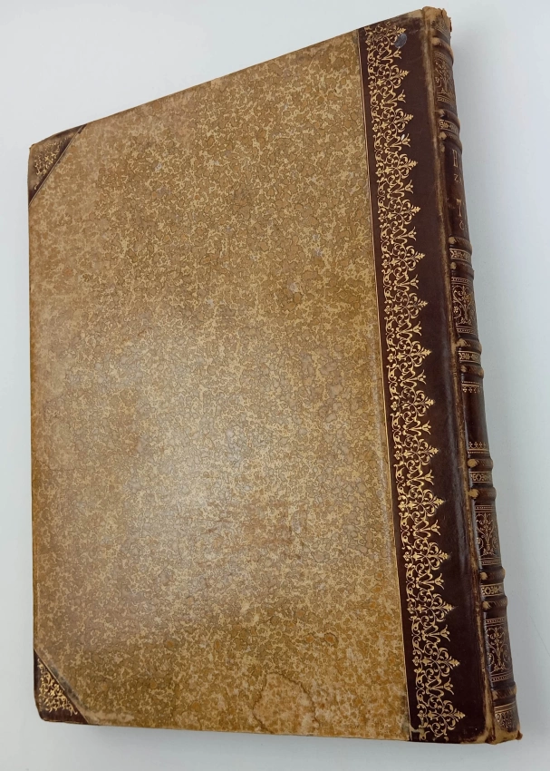 odřené desky, rozkládací mapa vyspravovaná páskou, chybí obrazová příloha ,,Znaky starých rodin českých I.", převazba, polokožená
