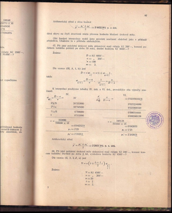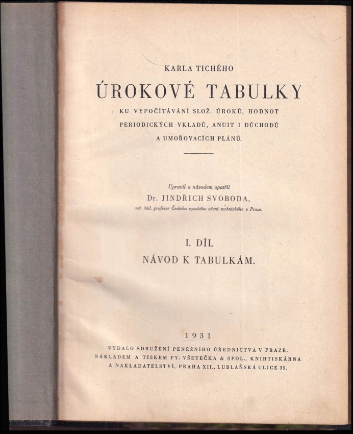 Karla Tichého Úrokové tabulky ku vypočítávání slo. úroků, hodnot periodických vkladů, anuit i důchodů a umořovacích plánů, I. díl