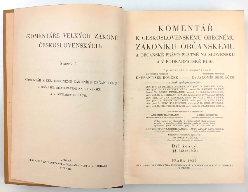 Komentář k Československému obecnému zákoníku občanskému a občanské právo platné na Slovensku a v Podkarpatské Rusi1937 | Nákladem Právnického knihkupectví a nakladatelství V. Linhart