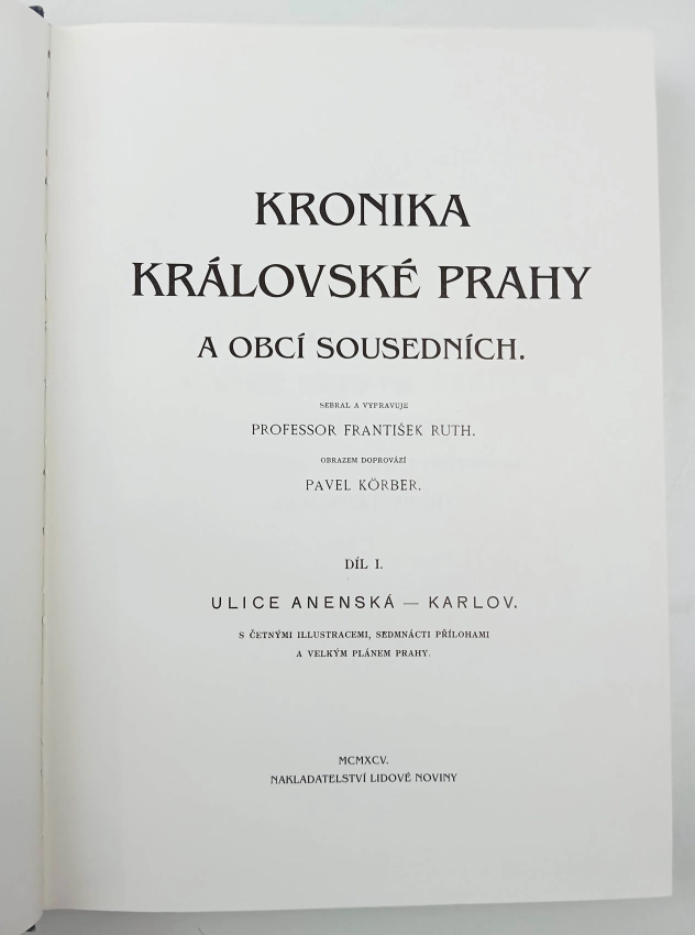 Kronika královské Prahy a obcí sousedních, Ulice Anenská - Karlov 1995 Díl I (472 s., 17 s. barev. il, 2. vyd.)Kronika královské Prahy a obcí sousedních, Karlova třída - U Půjčovny 1995 Díl II (S. 473-898, [12] s. obr. příl. (některé barevné), 2. vyd.)