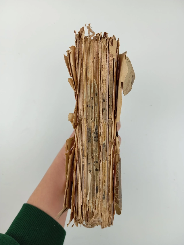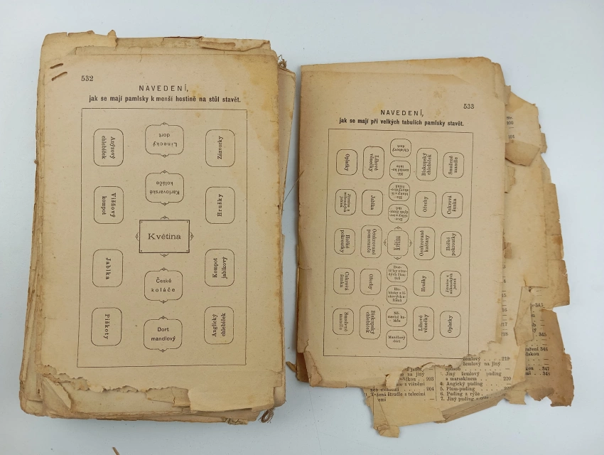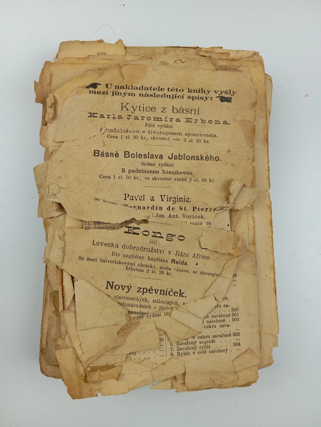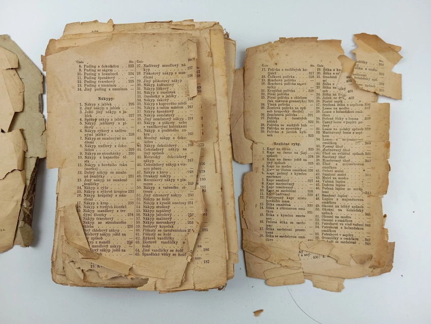 rozpadlá vazba, stránky volně, dochováno pouze torzo obálky, chybí jeden list rejstříku, stránky samotného textu potrhané po okrajích, text je ale čitelný, stránky rejstříku potrhané místy se ztrátami, Fleky, nafoceno
