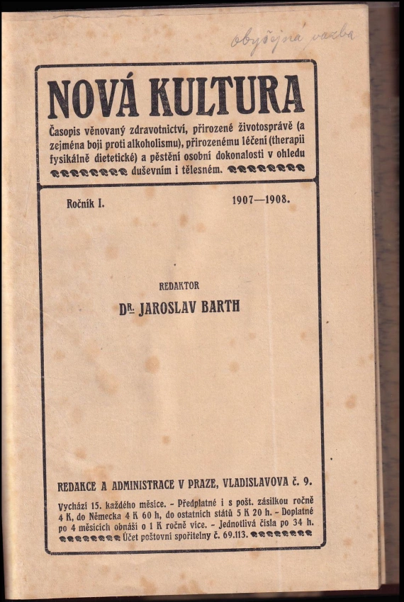 Nová kultura, kompletní ročník I. (1907 - 1908), čísla 1. - 12. : časopis věnovaný zdravotnictví, rozumné životosprávě, přirozenému léčení (therapii fysikálně dietetické) a pěstění osobní dokonalosti v ohledu duševním a tělesném