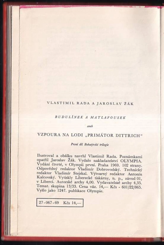 Budulínek a Matlafousek, aneb, Vzpoura na lodi "Primátor ..., první díl Bohatýrské trilogie 1969 1. díl (101, [3], 4. vyd.)Nové pověsti české, aneb, Dobrodružství šesti trampů, epopej z válek trampsko-paďourských :... 1970 2. díl Bohatýrské trilogie (288 s., 1. vyd.)
