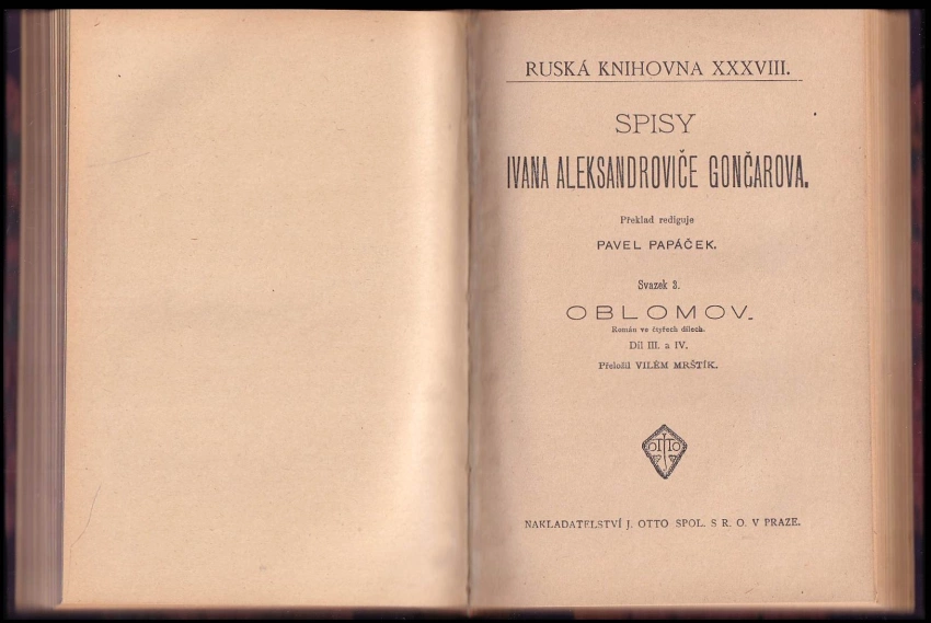 Oblomov, román ve čtyřech dílech 1902 Díl I. a II (338 s.)Oblomov, román ve čtyřech dílech 1902 Díl III. a IV (245 - [i])