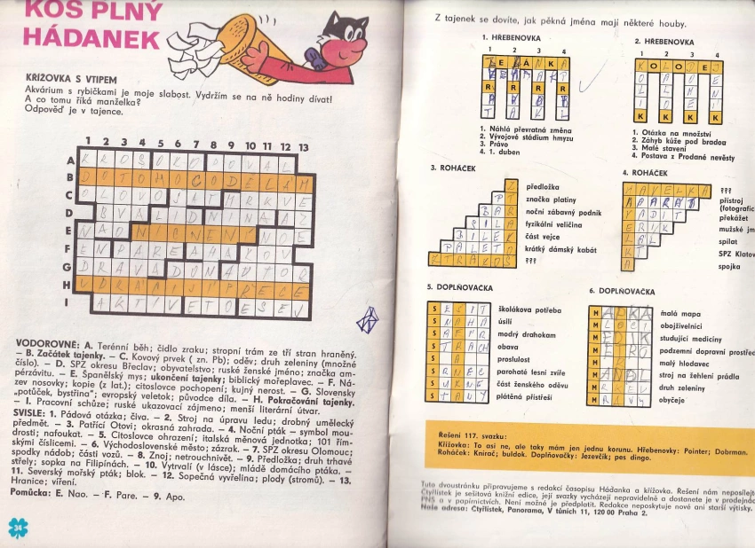 lehce natrhnutý hřbet, dole pod sponkou, křížovka a doplňovačky vyplněné propiskou, část tužkou