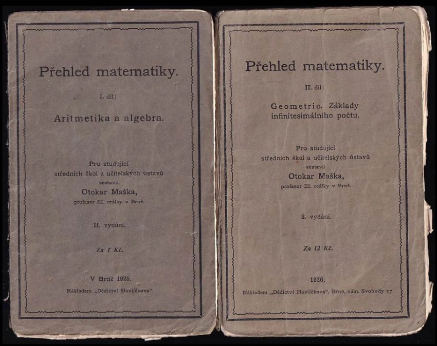 Přehled matematiky, Aritmetika a algebra 1925 I. díl (95 s., 2. vyd.)Přehled matematiky, Geometrie, základy infinitesimálního ... 1926 II. díl (160 s., 2. vyd.)