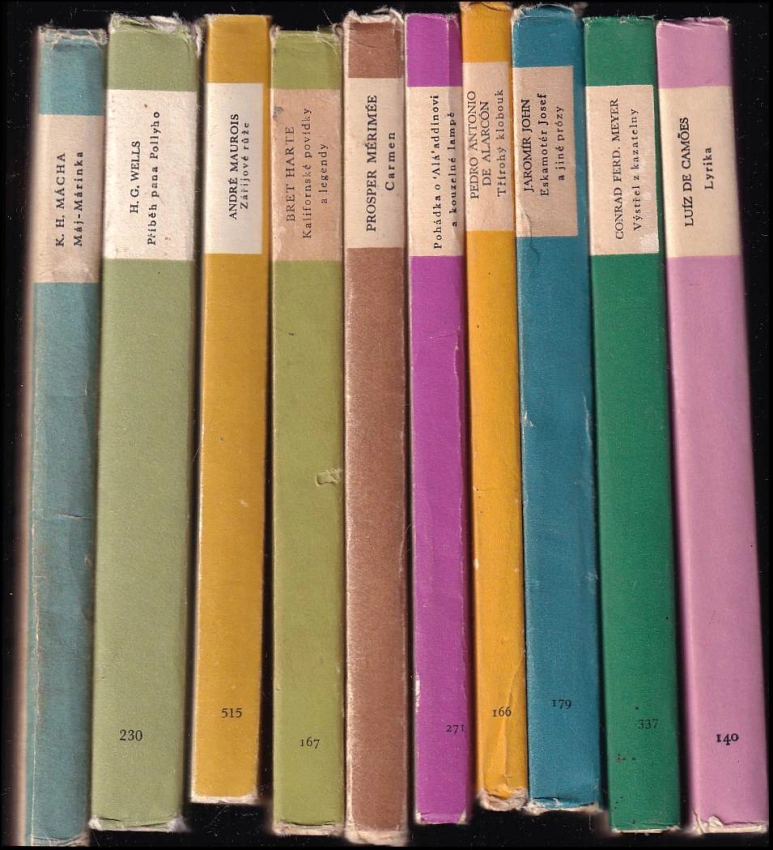 10X EDICE SVĚTOVÁ ČETBA - Výstřel z kazatelny ; Páže Gustava Adolfa ; Pokušení Pescarovo + Lyrika + Eskamotér Josef a jiné prózy + Třírohý klobouk + Pohádka o 'Alá' addínovi a kouzelné lampě + Carmen + Kalifornské povídky a legendy + Zářijové růže + Příběh pana Pollyho + Máj - Márinka