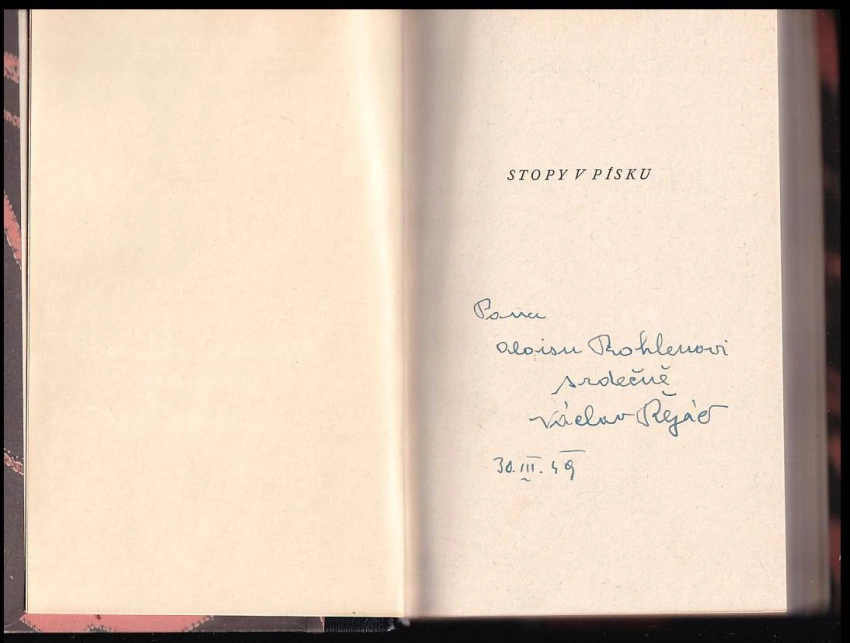 Stopy v písku PODPIS A VĚNOVÁNÍ VÁCLAVA ŘEZÁČE ALOISI ROHLENOVI