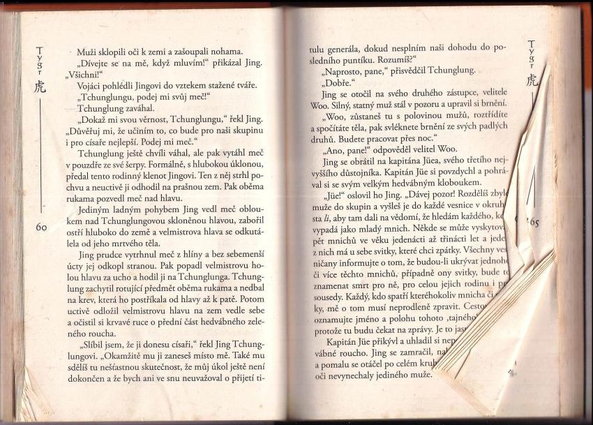stránky s flíčky, lehce cítit po vlhkosti, ohnuté kraje stránek, špinavé desky
