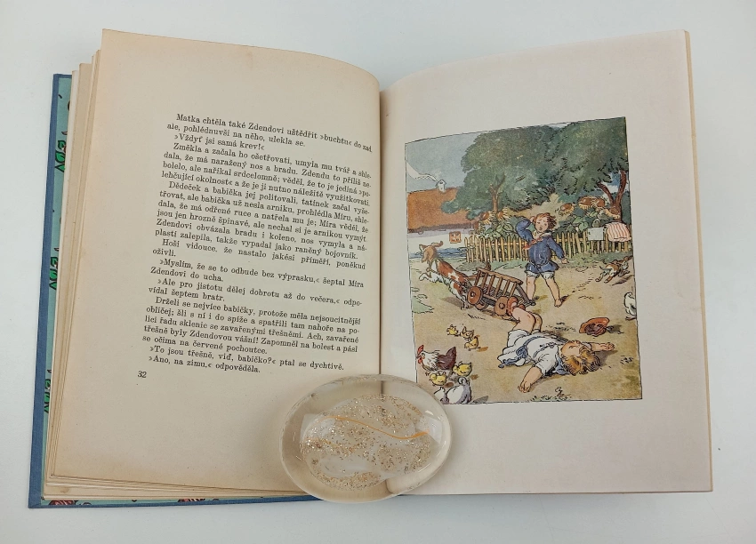poškozený hřbet, knižní blok v hezkém stavu, neautorská dedikace