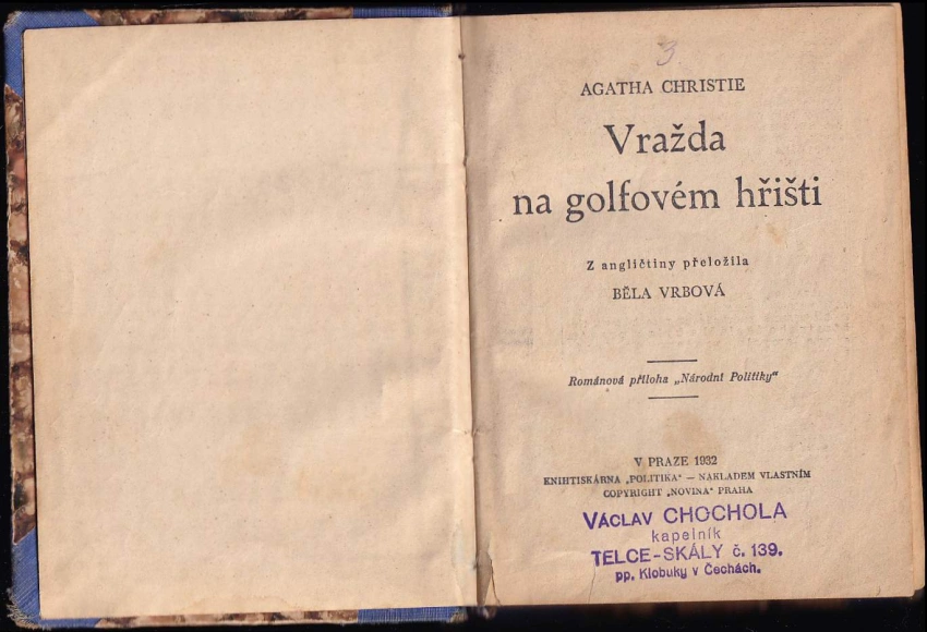 prasklý hřbet, vazba prasklá, vše drží, razítko původního majitele