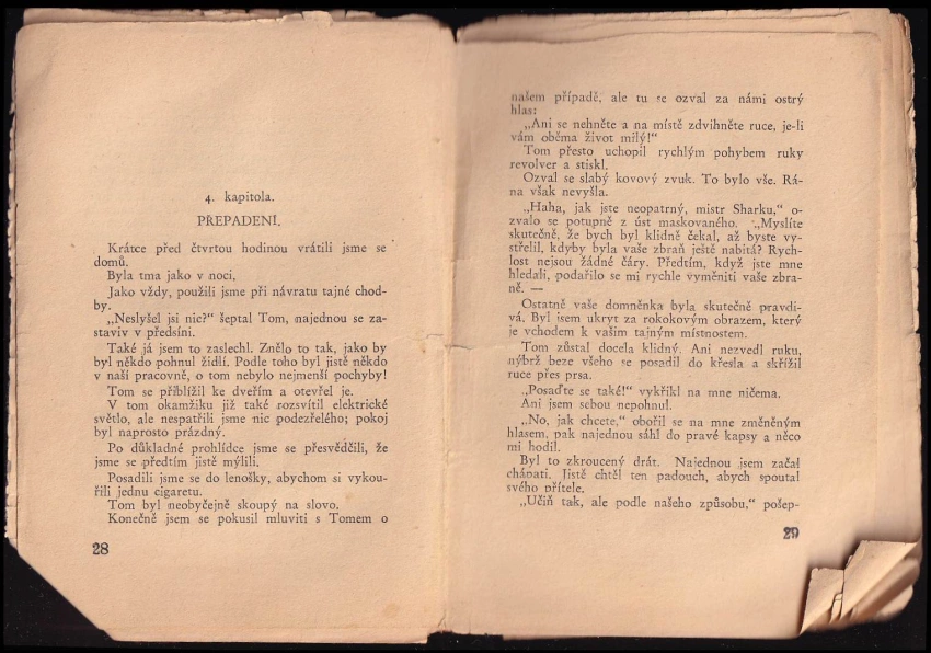 natrhnutý hřbet, natrhnuté stránky, ohnuté rohy, zašlé stránky, razítko