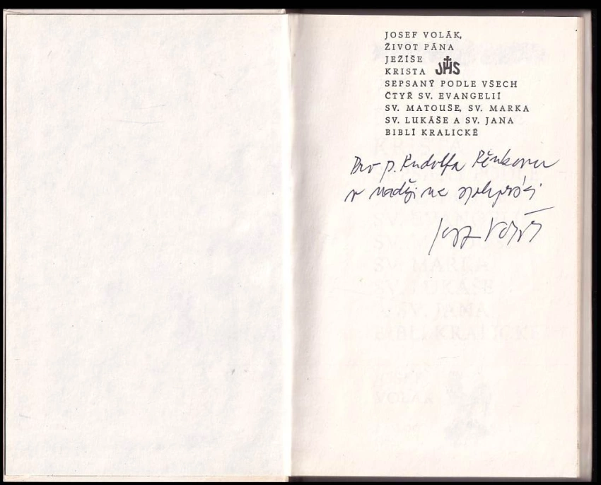 Život Pána Ježíše Krista sepsaný podle všech čtyř sv. evangelií sv. Matouše, sv. Marka, sv. Lukáše a sv. Jana Biblí kralické DEDIKACE JOSEF VOLÁK