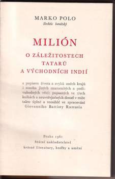 Marco Polo: Milión : o záležitostech Tatarů a Východních Indií s popisem života a zvyků oněch krajů i mnoha jiných znamenitých a podivuhodných věcí: popsaných ve třech knihách a neuveřejněných dosud v míře takto úplné a rozsáhlé ve zpracování Giovanniho Battisty Ramusia