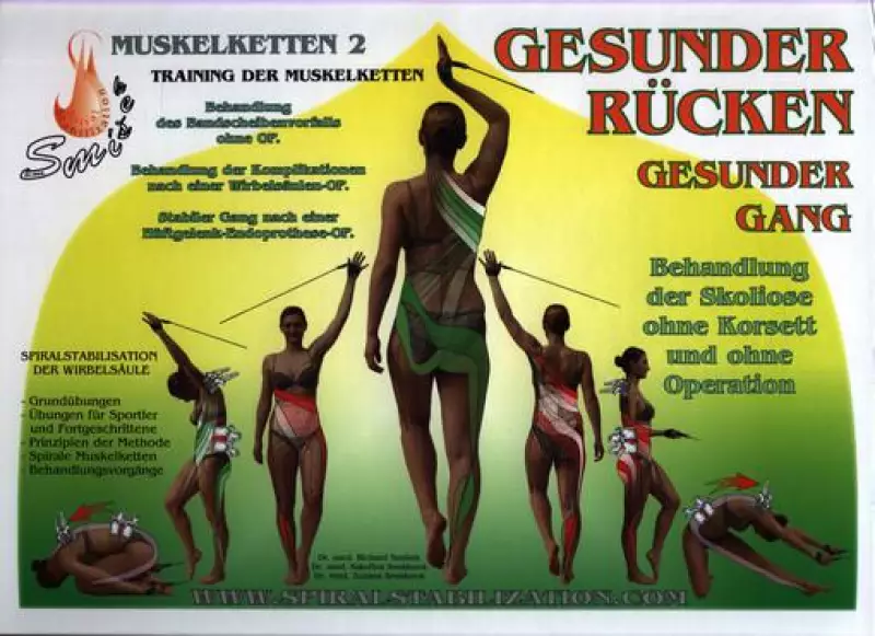 Skolióza : svalové řetězce 4 : spirální stabilizace páteře : hyperlordóza, hyperkyfóza, vadné držení těla : léčba spirálně stabilizovaným svalovým korzetem : manuální příprava, pohybová léčba skoliózy bez korzetu a operace : metoda spirální stabilizace páteře : SMíšek systém
